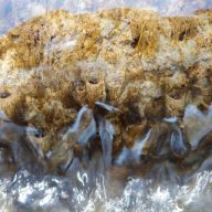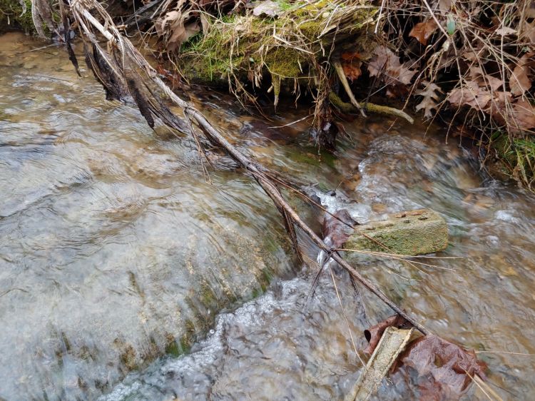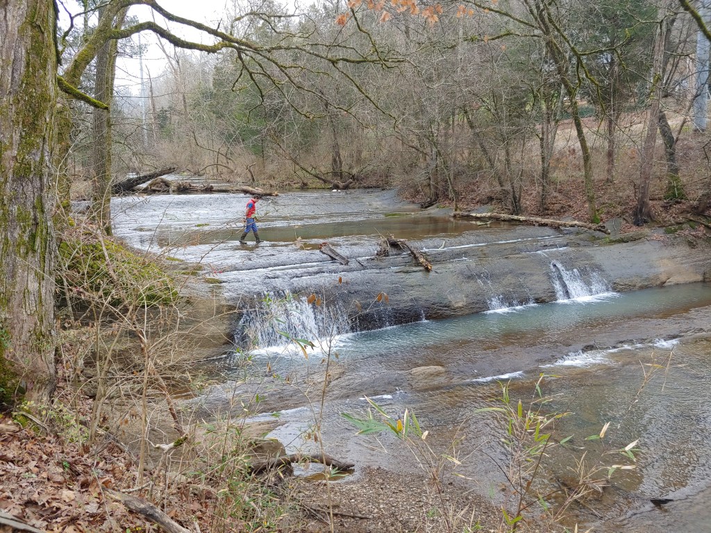 At low reservoir levels, flow falls over this natural channel-spanning bedrock ledge. At high reservoir levels, the backwater effect from the confluence with the French Broad River (about 1,000 feet downstream) raises the water level to cover most of the ledge.